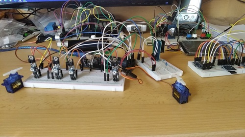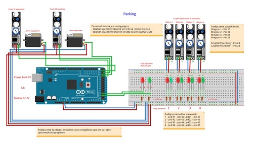 - Szlaban wyjazdowy ( servo) który podnosi się gdy czujnik wykryje samochód który podjechał do szlabanu.